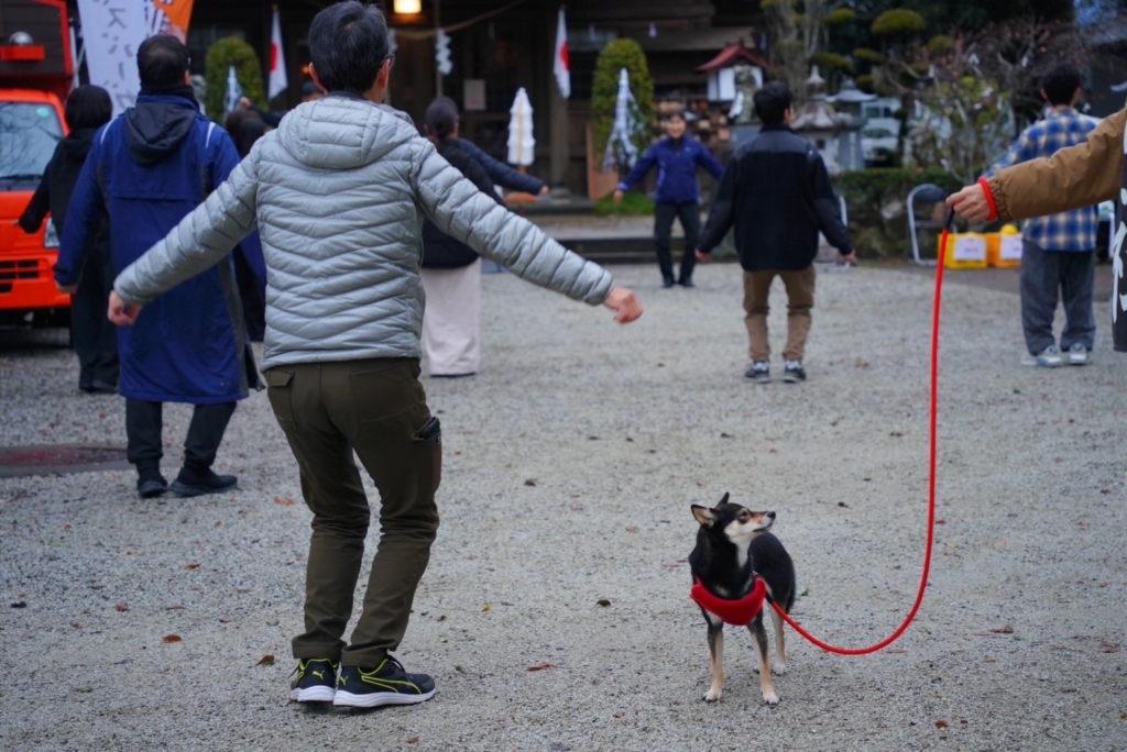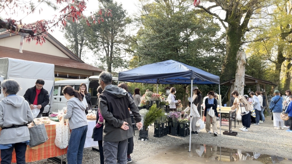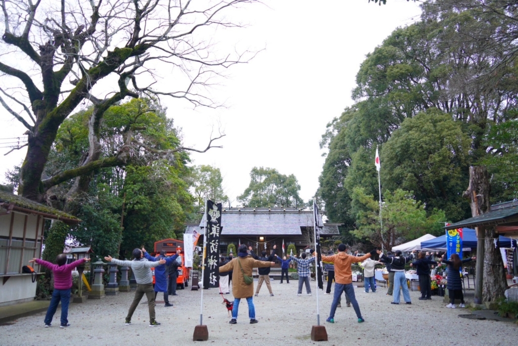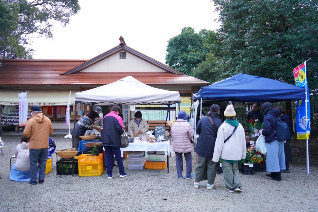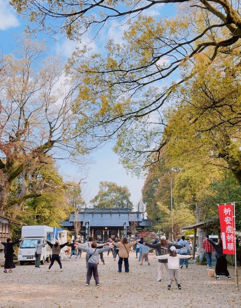 神社の境内で、みんなで身体を動かし、温め、さぁその後はお買い物。
