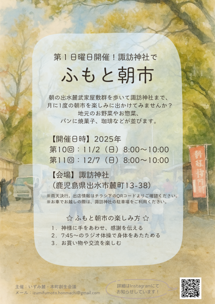 毎月第1日曜日の朝8:00~10:00、出水麓武家屋敷群にある諏訪神社にて「ふもと朝市」が開催されています。