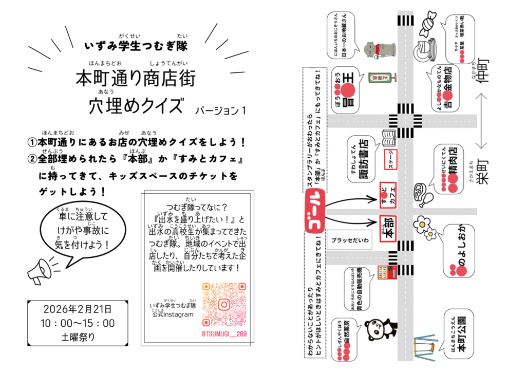 出水を盛り上げたい高校生たちが集まって結成された「いずみ学生つむぎ隊」による、【街路灯フラッグのクイズラリー】を実施しています。